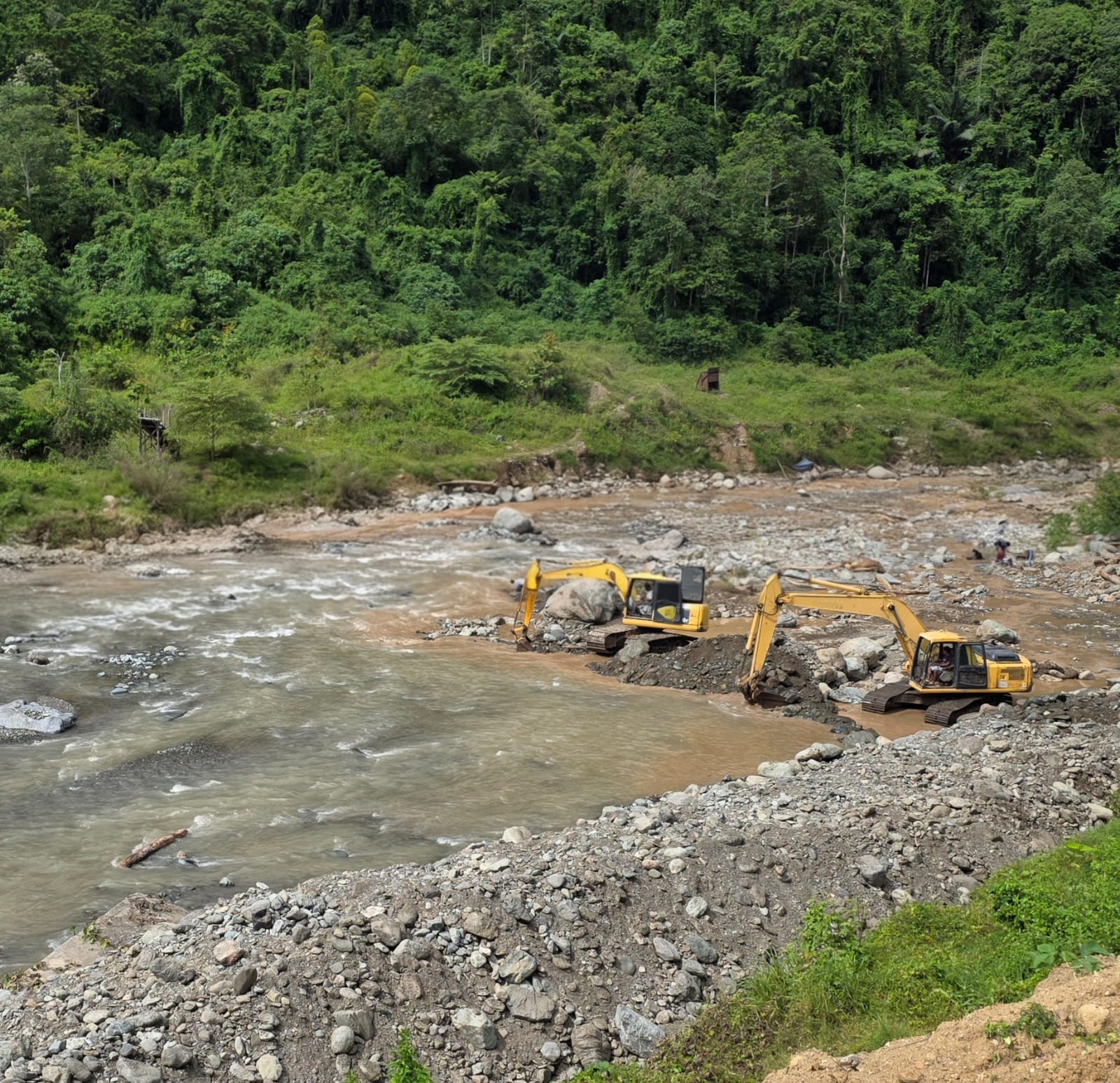 Berdasarkan pantauan di lokasi, excavator digunakan untuk melakukan pembersihan area terdampak sedimentasi, penataan alur sungai, serta penguatan titik-titik yang dinilai rawan terhadap limpasan air saat hujan berintensitas tinggi.